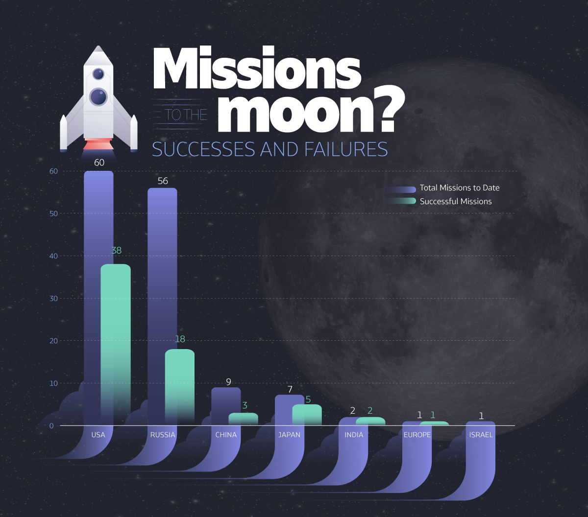 The US sent the most missions to the moon, 38 of them were got successful followed by the former Soviet Union, had 56 missions on its credit.