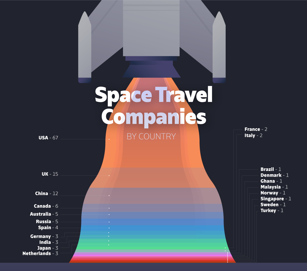 There are more than a hundred space transport companies worldwide at the moment, according to SpaceFund’s launch database. A bulk of them are based in the US, followed by the UK, then China.